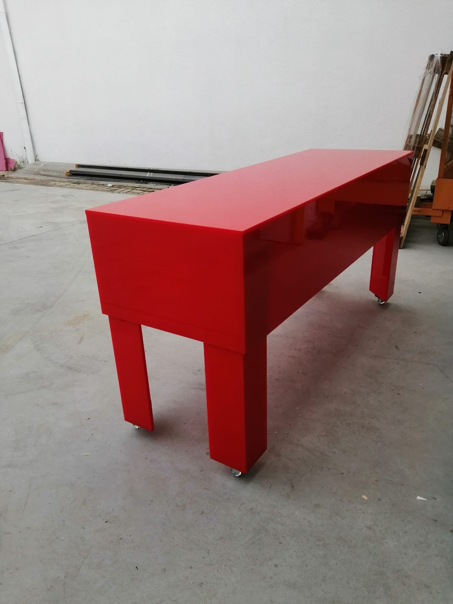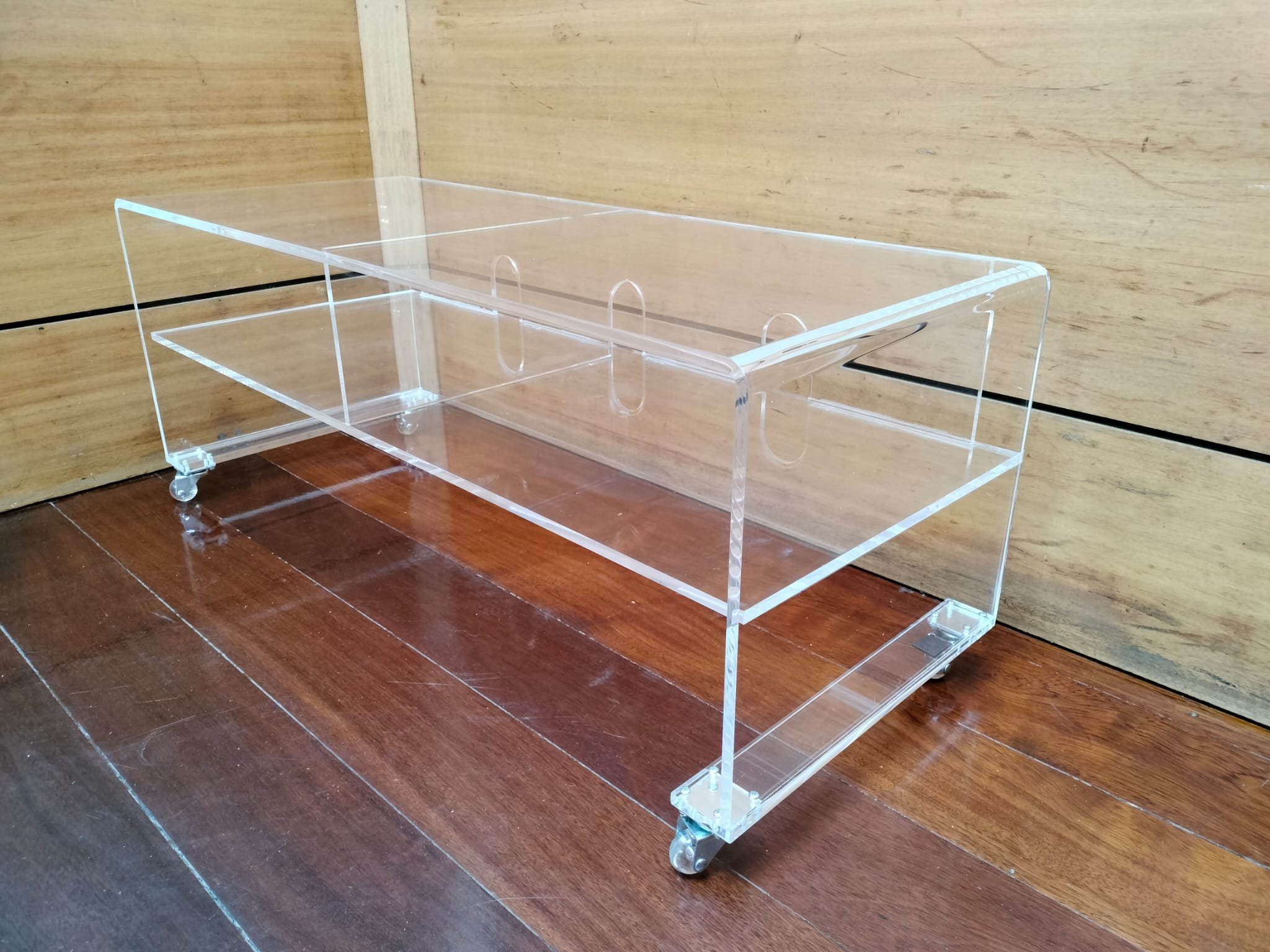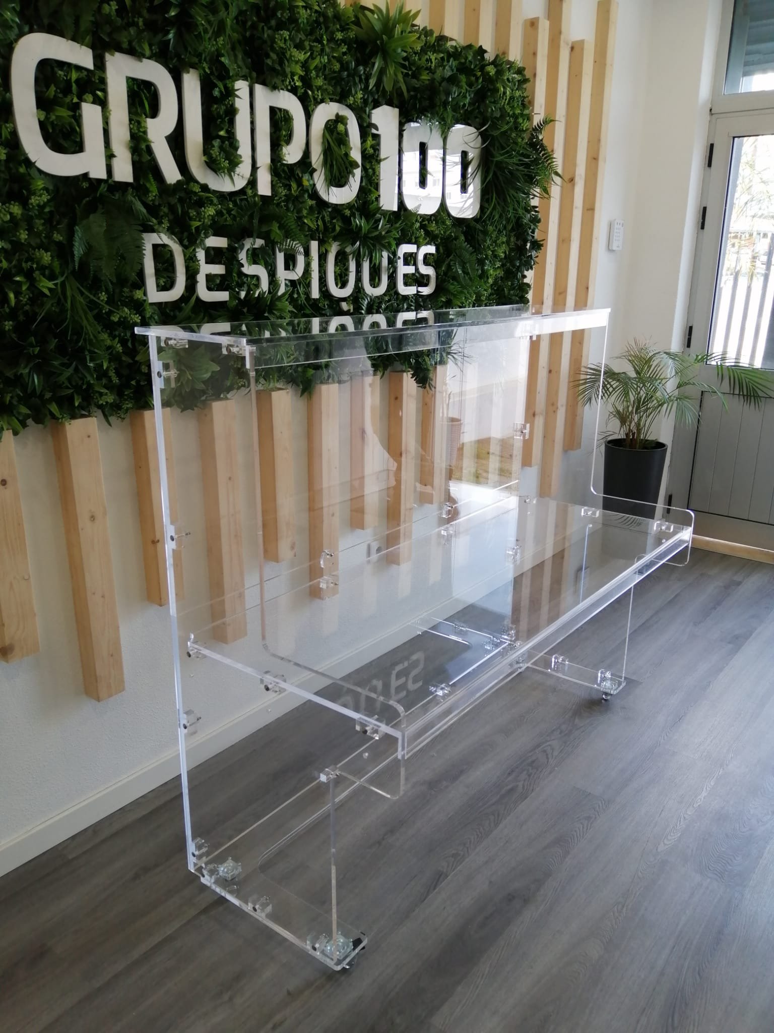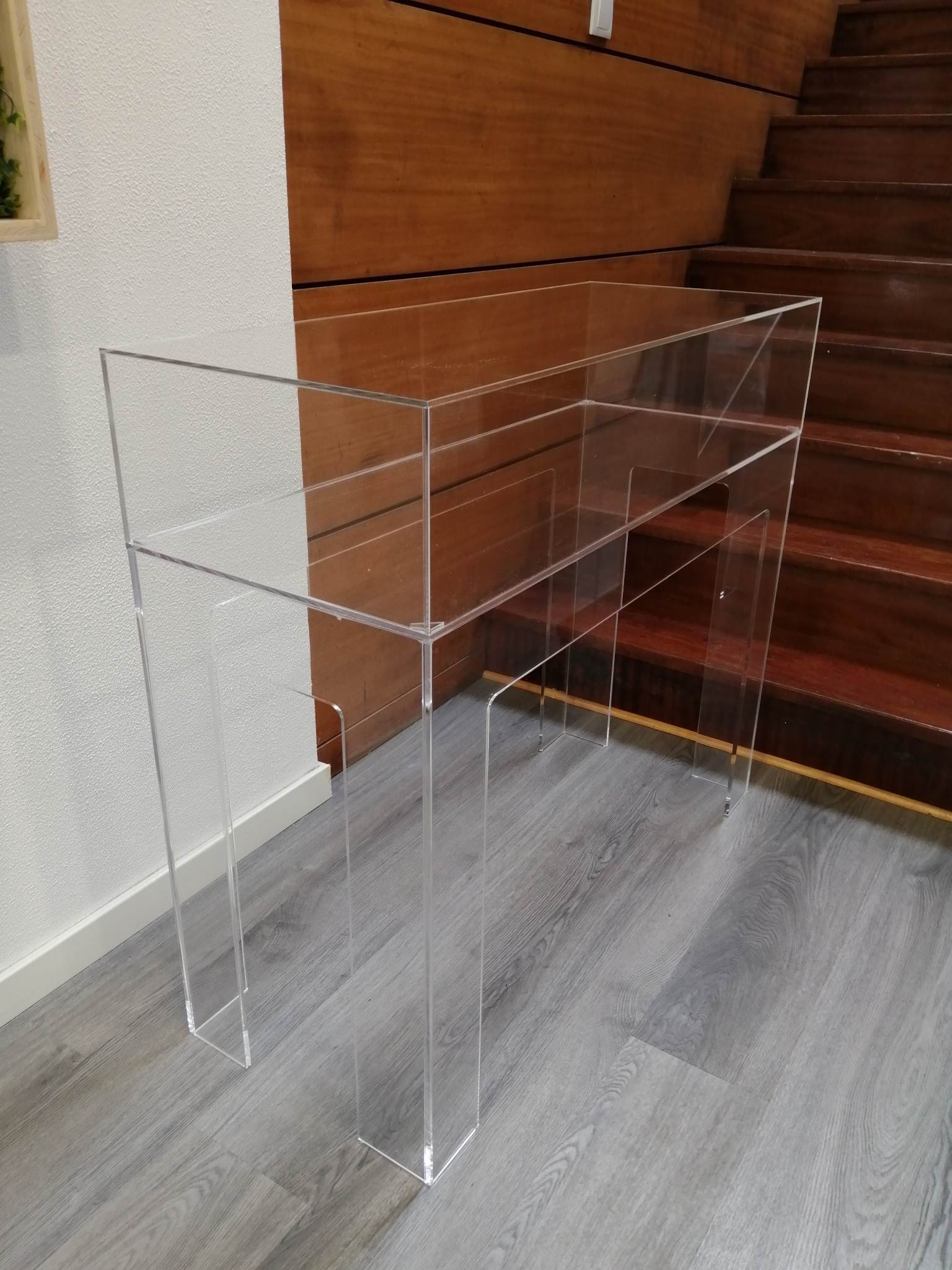 Mesas, estantes, vitrines e secretárias em acrílico, perfeitas para espaços de exposição, receção ou áreas de apoio.