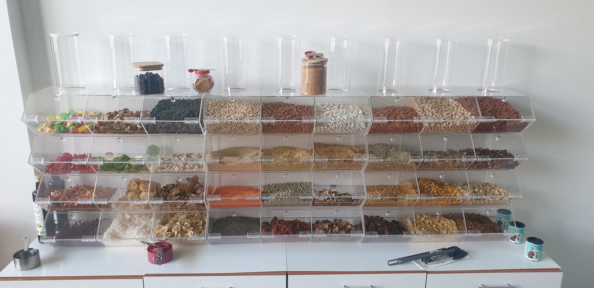 Elementos modulares que garantem organização clara e exposição atrativa de materiais e produtos.