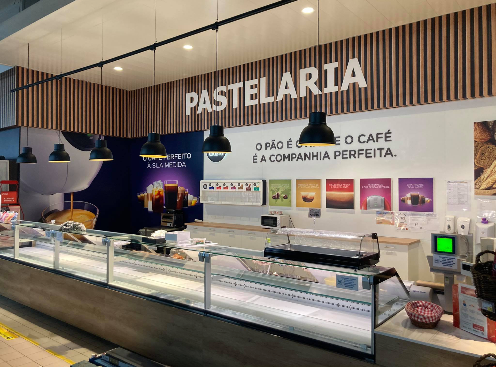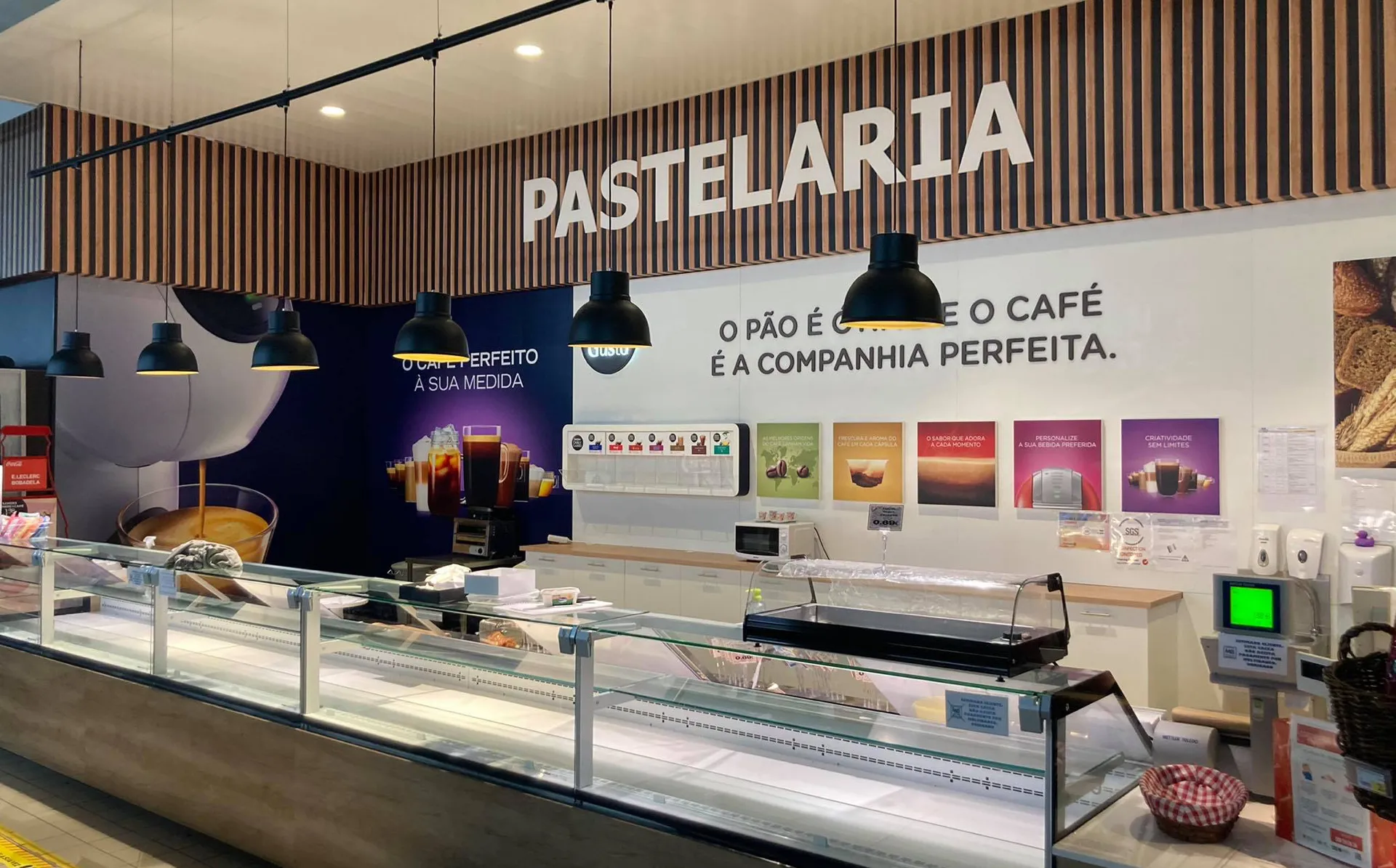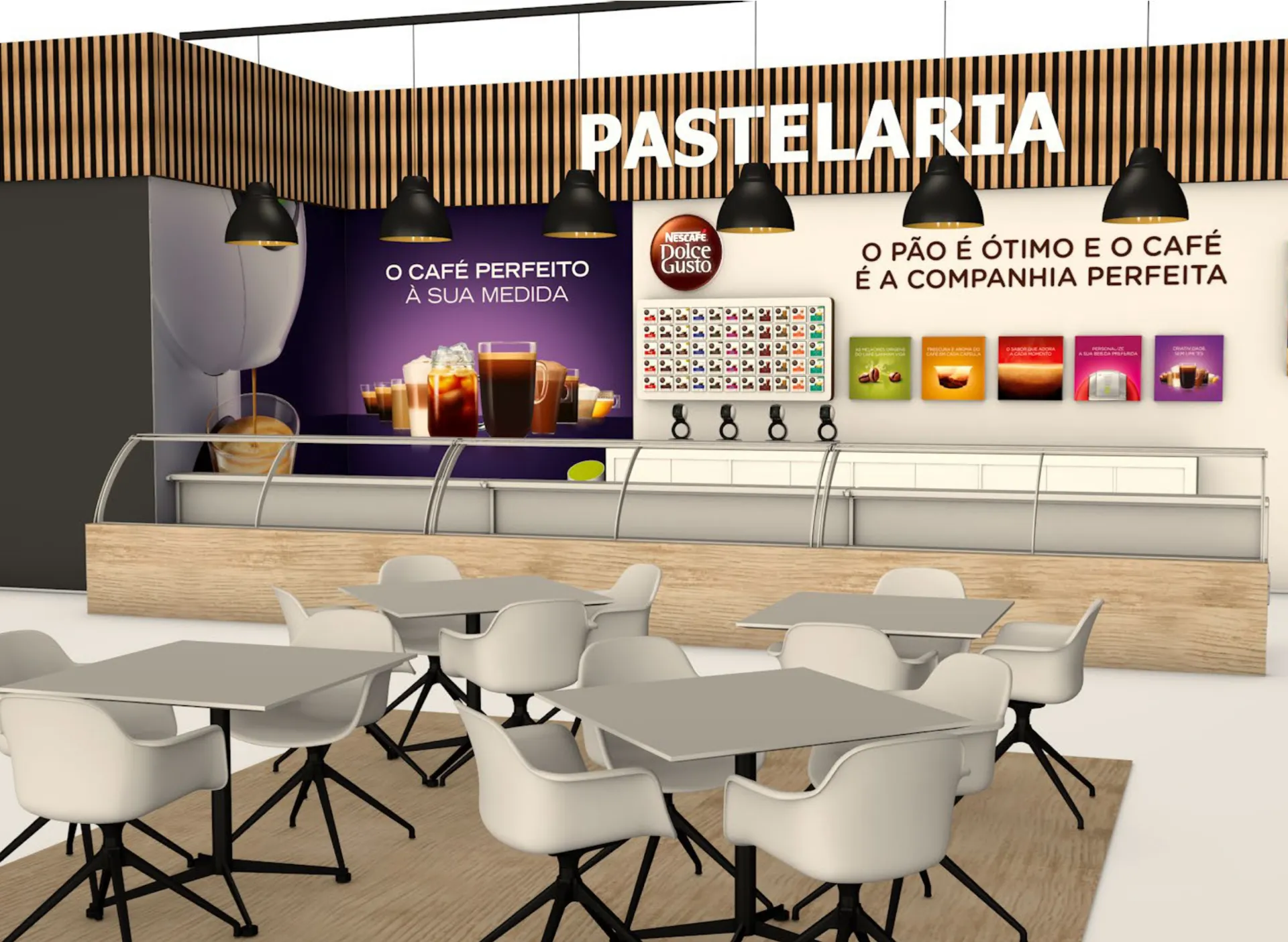A decoração da Cafetaria E. Leclerc Bobadela para a Nescafé Dolce Gusto traduz-se numa valorização estética e funcional do espaço, combinando elementos de comunicação visual, mobiliário e revestimentos que asseguram uma experiência diferenciada e coerente com a marca.