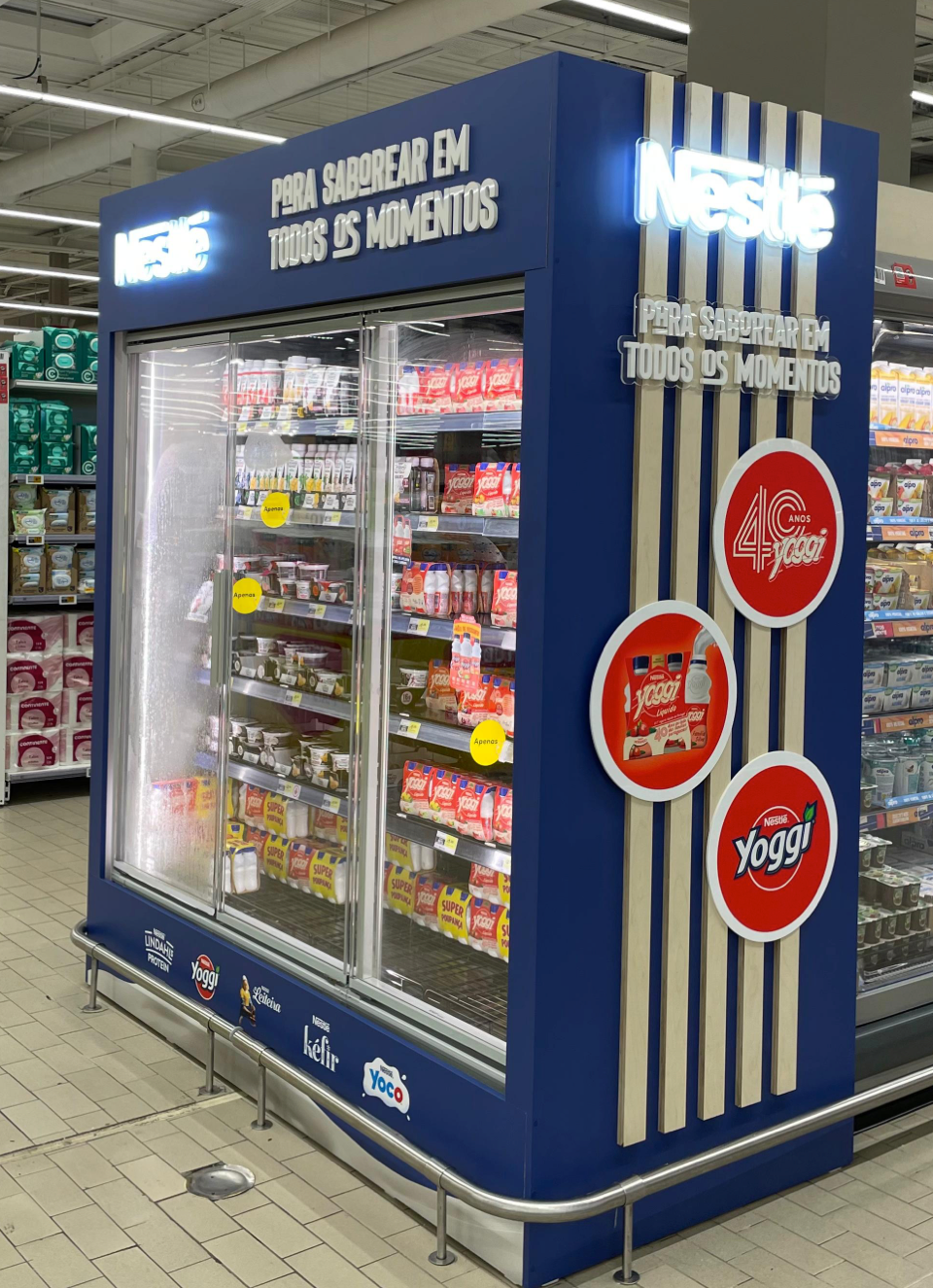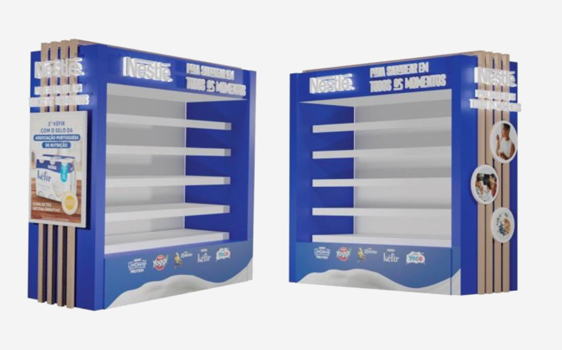 Os topos foram construídos em melamina, com revestimento em vinil HD impresso e decoração com barrotes de madeira natural. Os logotipos Nestlé foram aplicados em caixa de luz, garantindo maior visibilidade no ponto de venda.