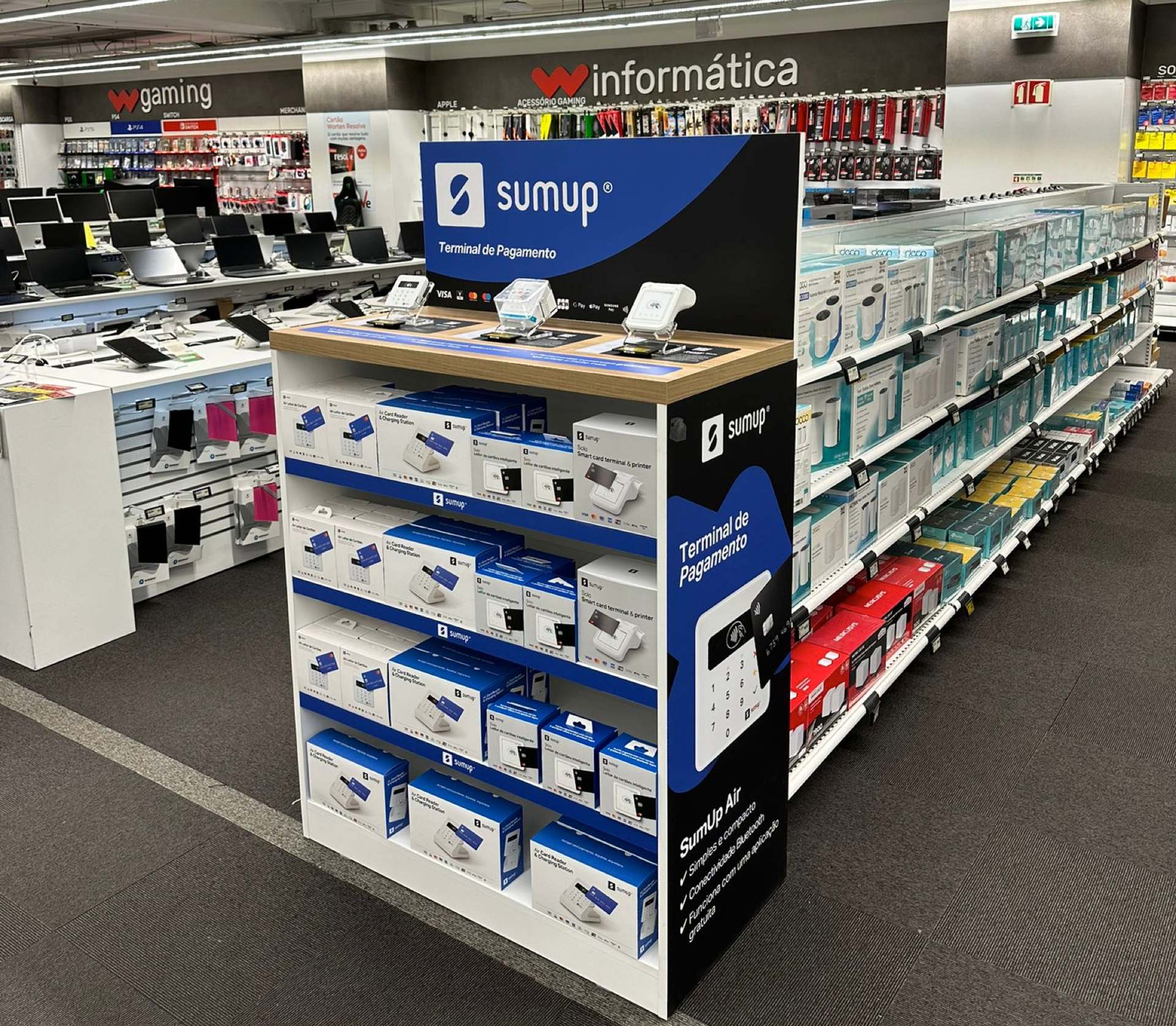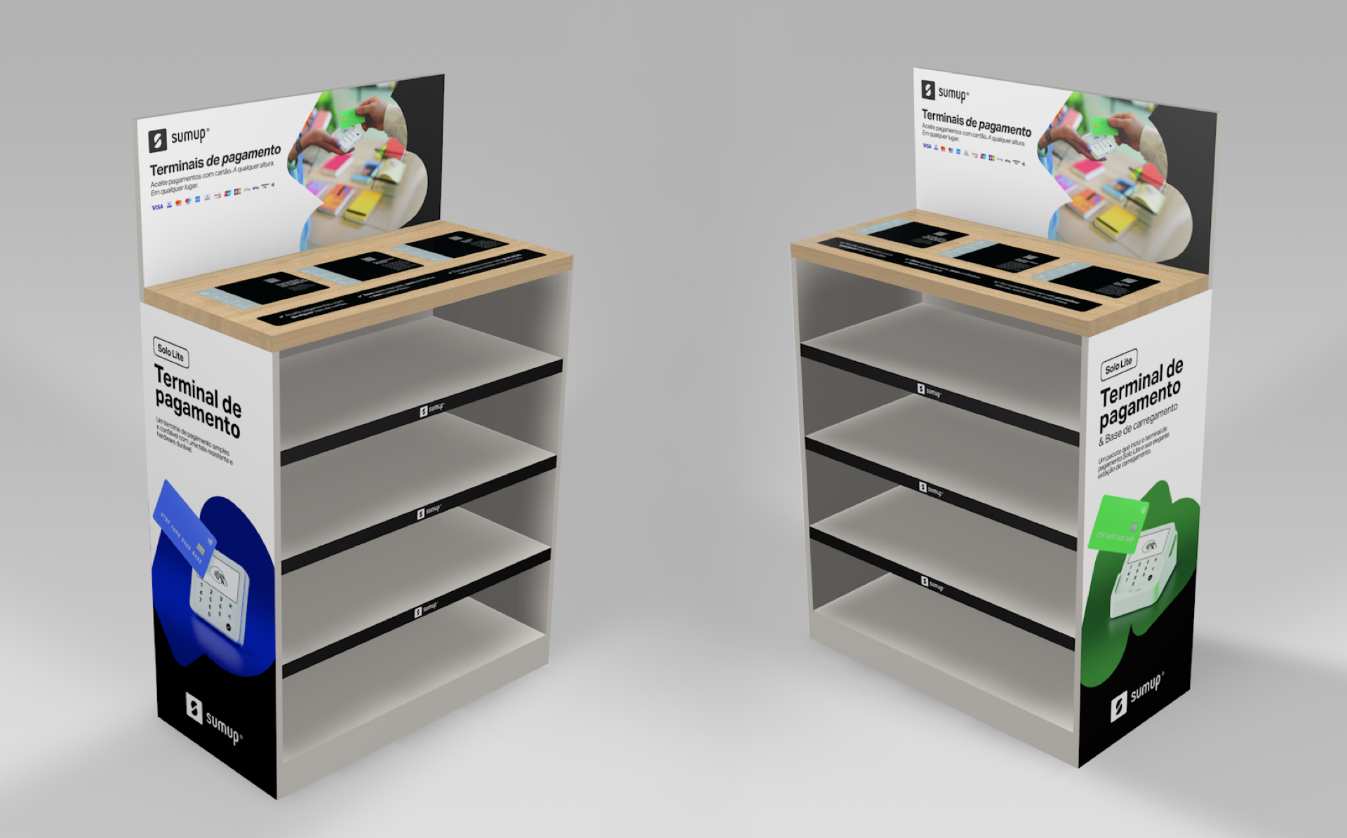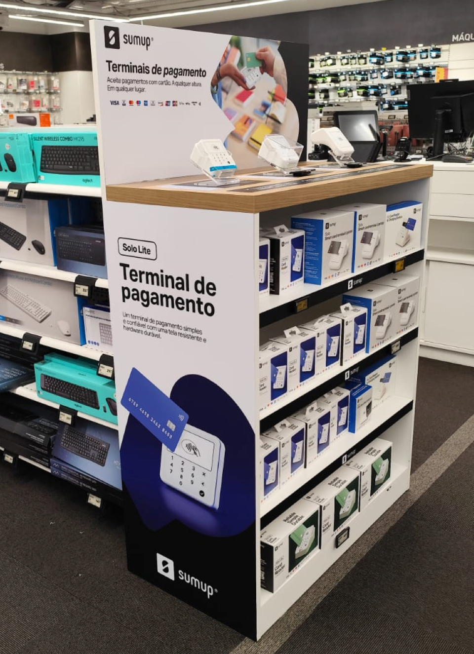 Os expositores foram construídos em melamina branca e carvalho, conferindo robustez e acabamento premium. Aplicação de vinil impresso em alta-definição (HD), garantindo comunicação visual atrativa e durável. Cada expositor integra displays em acrílico cristal, especialmente concebidos para a apresentação dos leitores de pagamento automático SumUp, proporcionando clareza, organização e destaque ao produto. Dimensões Gerais: 100 x 160 x 50 cm.